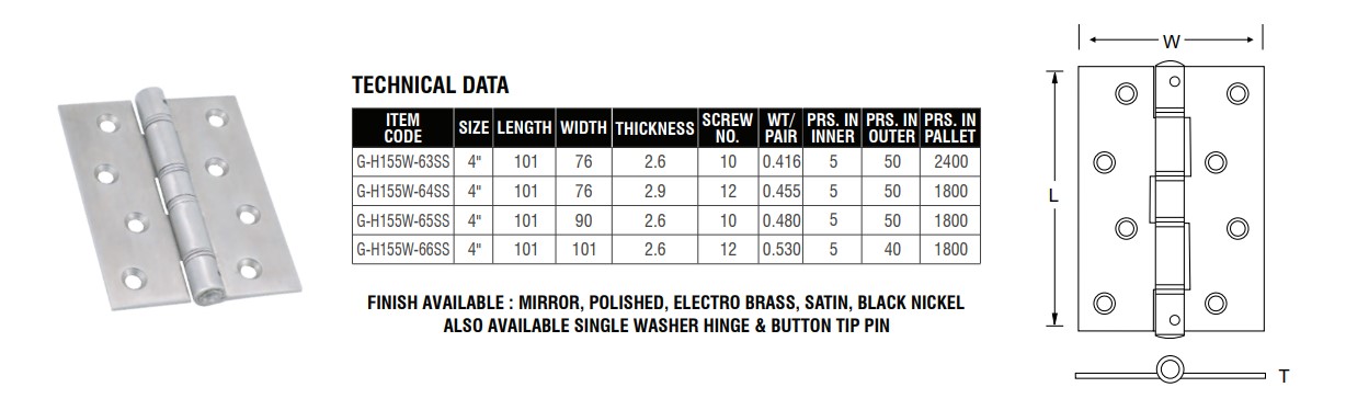 The 155W heavy-duty butt hinge is crafted from premium stainless steel and features a cranked knuckle for superior door alignment. Designed with double washers to reduce friction and enhance smooth movement, this hinge includes a secure spun or button tip pin for added durability. Ideal for demanding environments, it is suitable for both internal and external heavy doors in commercial and industrial application