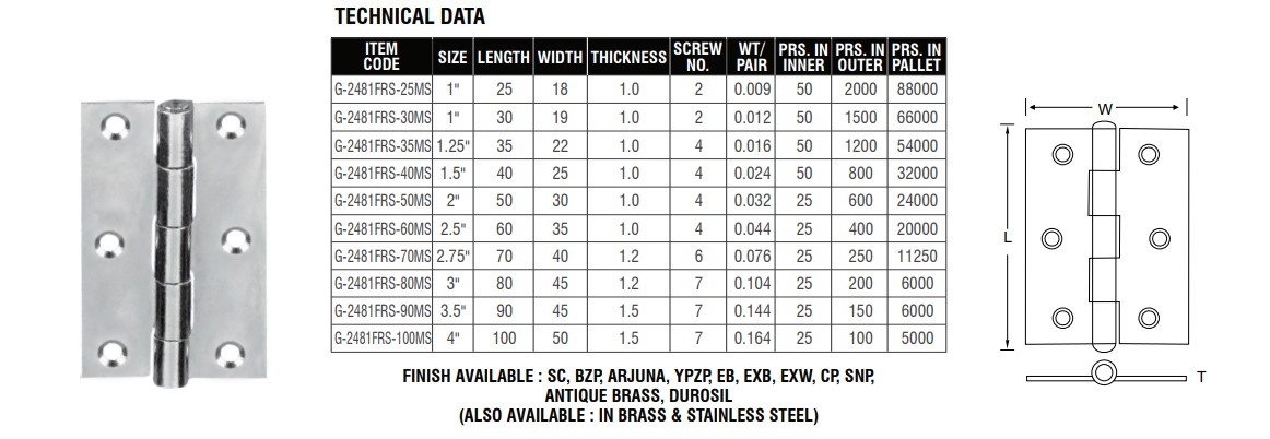 The 2481FRS Mild Steel Butt Hinge features an uncranked knuckle and fixed pin, designed according to French specification requirements. Manufactured from high-quality mild steel, it provides dependable strength and durability for a wide range of door applications. Suitable for both residential and commercial settings, this hinge ensures reliable performance and smooth movement in installations where French standards are required.