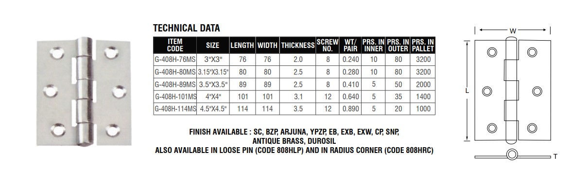 The 408H Mild Steel Broad Square Heavy Butt Hinge is designed for robust door installations requiring high load-bearing capacity. Crafted from durable mild steel, it features a cranked knuckle that enhances clearance and smooth door operation. The broad square profile provides added strength and stability, making it ideal for commercial, industrial, and high-traffic environments. Suitable for timber or metal doors where reliability and structural integrity are key