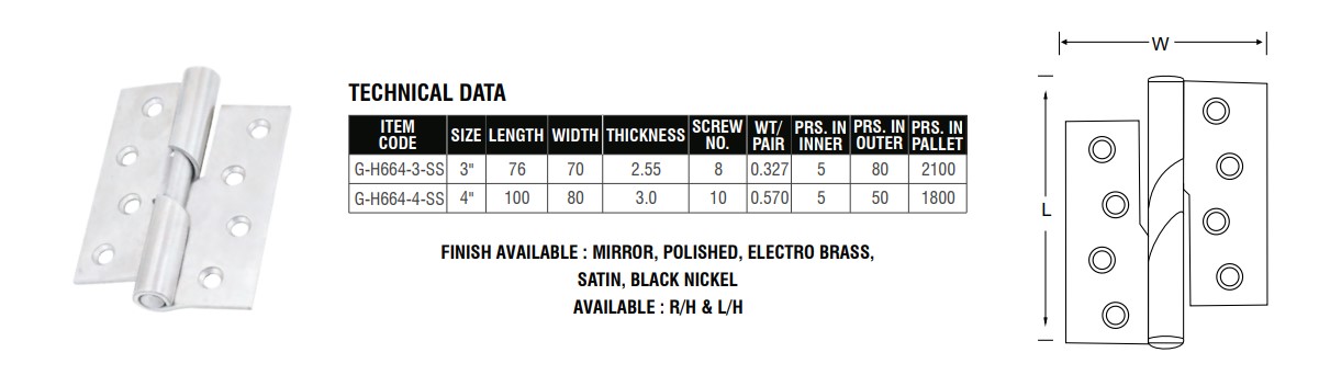 The 664SS rising butt hinge is constructed from high-grade stainless steel and features a cranked knuckle design to assist doors in self-closing by rising as they open. With a handed lift-off pattern for easy removal and maintenance, this hinge includes a flush pin for a clean, secure fit. Suitable for doors that require automatic closing without spring mechanisms, especially in traditional or high-traffic settings.