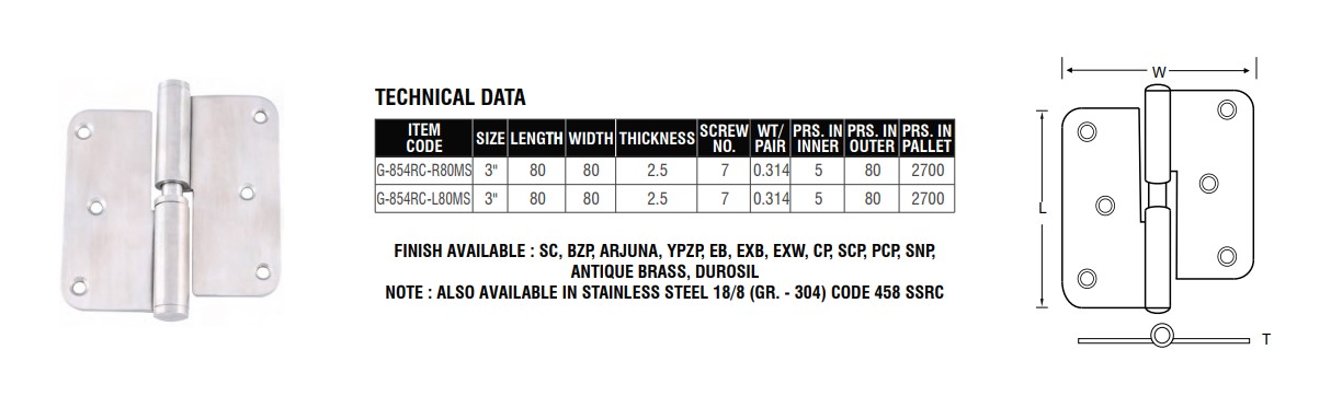 The 854RC Mild Steel Radius Corner Hinge is designed for applications requiring both functionality and convenience. Its cranked knuckle and handed configuration enable doors to rise slightly upon opening, aiding automatic closure through gravity. The lift-off feature allows for quick removal of doors without unscrewing the hinge, ideal for maintenance or access needs. Radius corners provide a neat finish and ease of installation, making this hinge suitable for modern timber or metal doors in residential and commercial spaces.