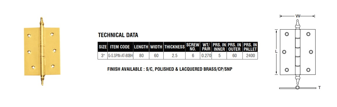 Premium brass butt hinges with decorative acorn tips and a durable stainless steel pin.