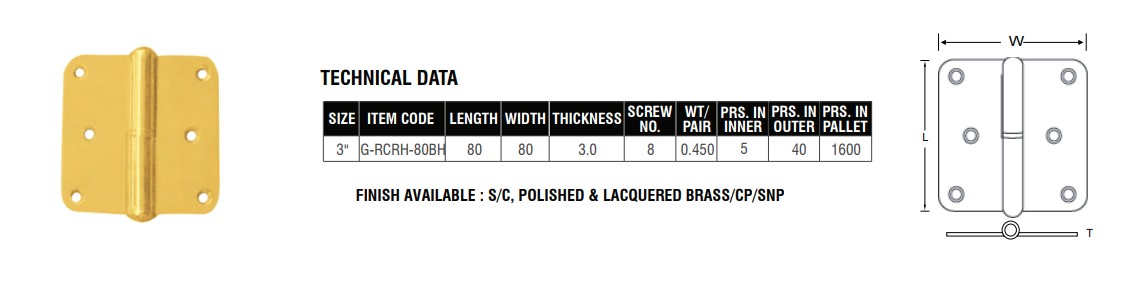 Crafted from premium brass, these butt hinges feature a sleek radius corner and a rounded head for a refined finish. Designed to blend functionality with style, they provide smooth door movement and are ideal for interior wooden doors. Their classic appearance makes them suitable for traditional and modern décor alike.