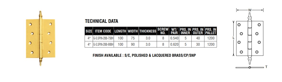 Brass Butt Hinges with Two Ball Bearings and Finial Head (S.S. Pin)