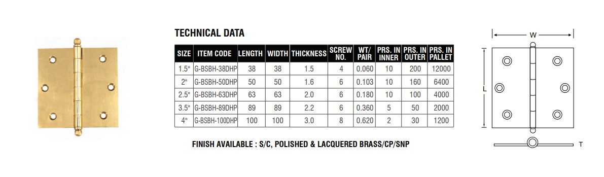 These high-quality brass square butt hinges are fitted with a dome head pin, combining durability with refined aesthetics. Designed for internal and external timber doors, they provide stable support and a smooth swinging action. The dome head adds a decorative touch, making them suitable for premium architectural and interior applications. Ideal for doors requiring both function and style.