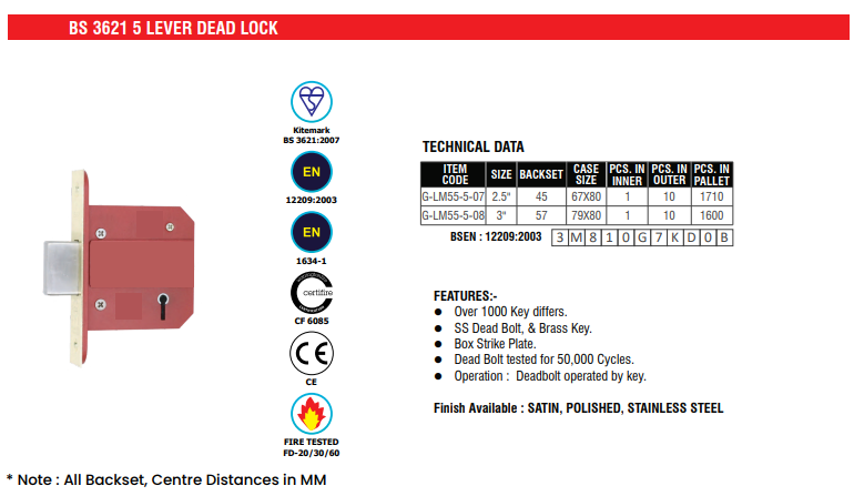 This 5 lever dead lock is tested and approved to BS 3621, meeting insurance and security standards.