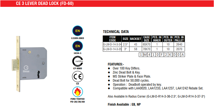 This 3 lever dead lock is CE-certified and suitable for FD-60 fire-rated doors.