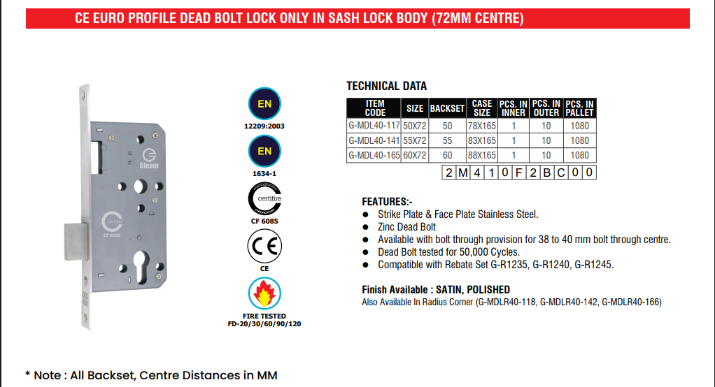 The CE Euro Profile Dead Bolt Lock Only in Sash Lock Body (72mm Centre) is a robust locking mechanism designed specifically for doors requiring secure deadbolt operation without a latch. With a 72mm centre measurement (distance from spindle to cylinder), it is fully compatible with standard euro profile cylinders and handles. This unit features a deadbolt-only function, making it ideal for applications where full locking security is needed without passage capabilities. Compliant with CE performance standards, it delivers smooth key operation, strong bolt projection, and lasting reliability for both residential and commercial installations.
