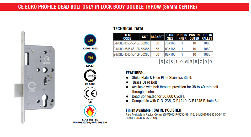 CE certified Euro Profile Dead Bolt Lock Body designed for high-security applications. This version features a double throw mechanism for enhanced locking strength and durability. It is configured with an 85mm centre measurement, ensuring compatibility with standard Euro profile cylinders. Ideal for residential and commercial doors requiring robust locking systems without a latch function. Suitable for timber and metal doors.