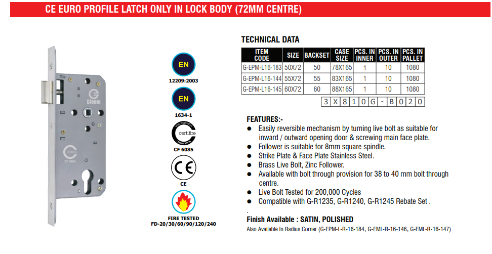 The CE Euro Profile Latch Only in Lock Body (72mm Centre) is a precision-engineered latch mechanism designed for euro profile cylinders. It provides smooth and reliable latching functionality without a deadbolt, making it ideal for passage doors where security locking is not required. With a standard 72mm centre, it is compatible with most lever handle and euro profile cylinder combinations. Certified to CE standards, this latch body is suitable for residential, commercial, and institutional use, offering ease of installation and long-term performance.