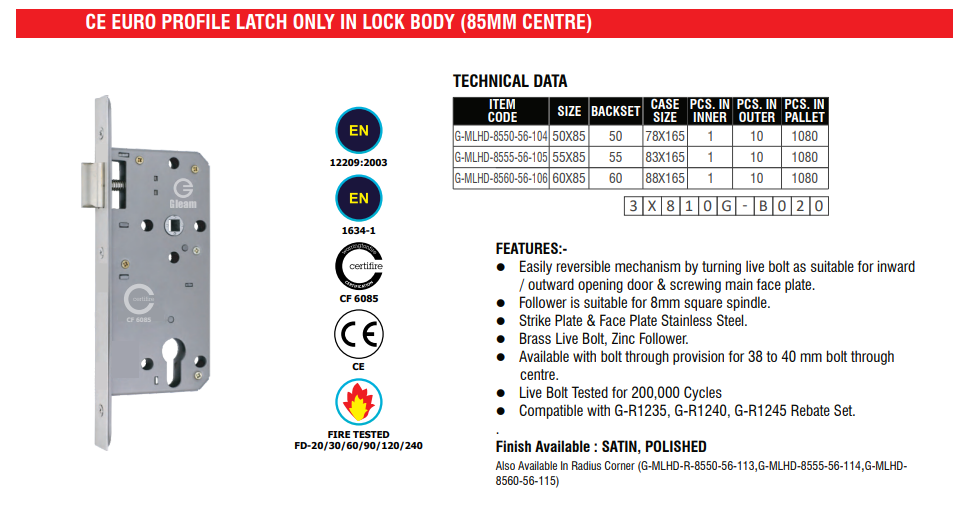 The CE Euro Profile Latch Only Lock Body (85mm Centre) is a precision-engineered mortise lock solution ideal for internal doors where latching without deadlocking is required. Featuring an 85mm centre (distance between the handle spindle and cylinder), it is designed for compatibility with standard euro profile cylinders and lever handles. This lock body provides smooth and reliable latch engagement, making it suitable for passage doors or doors with separate locking systems. Built to CE standards, it ensures durability, consistency, and ease of installation across a range of commercial and residential applications.