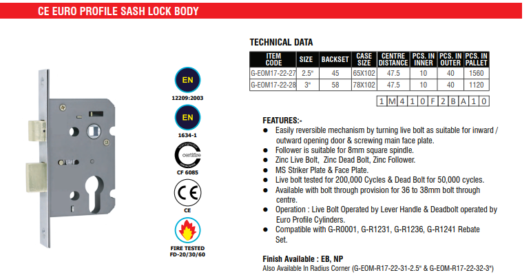 This sash lock body is CE-certified and designed for use with Euro profile cylinders.