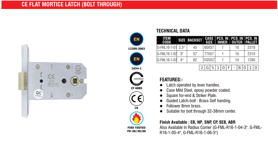 This CE-certified flat mortice latch features a bolt-through design for secure handle installation.