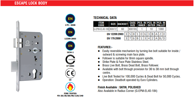 Escape lock body designed for emergency exit doors. Allows quick egress with secure locking.