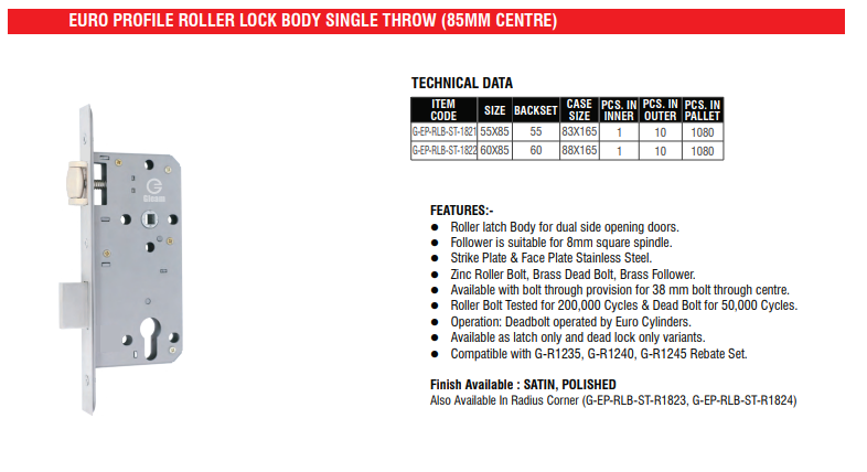 This euro profile roller lock body features an 85mm centre and a single-throw deadbolt, offering reliable locking for residential or commercial doors. The roller latch ensures quiet and smooth door operation, while the single-throw mechanism secures the door with one full turn of the key. Suitable for use with timber, aluminum, or uPVC doors.