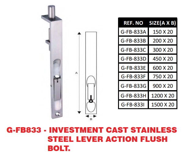 The G-FB833 Investment Cast Stainless Steel Lever Action Flush Bolt is engineered for high-performance door security in both commercial and residential settings. Made from precision investment-cast stainless steel, it ensures maximum strength, corrosion resistance, and long-lasting durability. The smooth lever action provides effortless operation, allowing one leaf of a double door to be securely locked into the frame or floor. Its flush design offers a clean, modern look while minimizing obstruction. Ideal for metal or wooden doors, the G-FB833 is perfect for high-traffic areas requiring dependable, discreet security hardware.