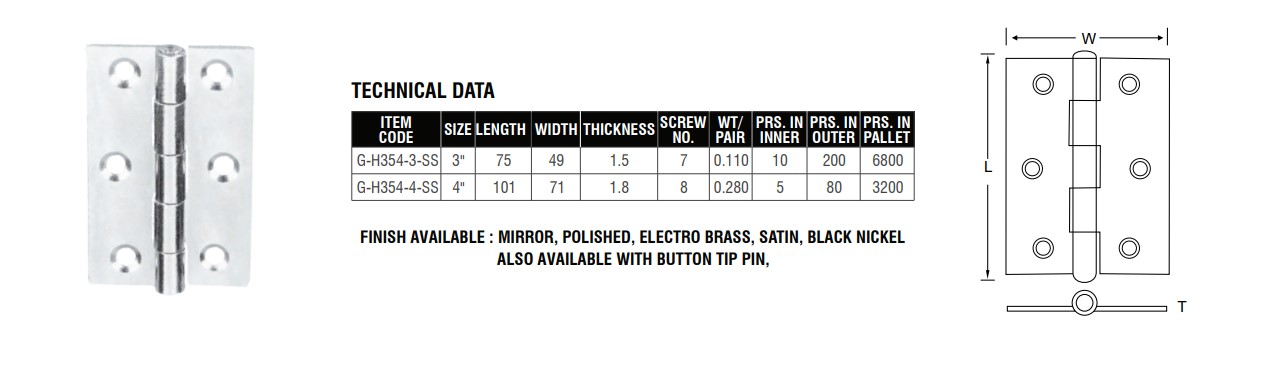 The G-H354-3-SS 354 is a precision-engineered stainless steel butt hinge with a standard cranked knuckle and fixed pin configuration. Designed to offer enhanced alignment and smooth door operation, it is ideal for applications requiring a strong, corrosion-resistant hinge. Suitable for timber, metal, or composite doors, this hinge ensures stability and longevity in both residential and commercial environment.