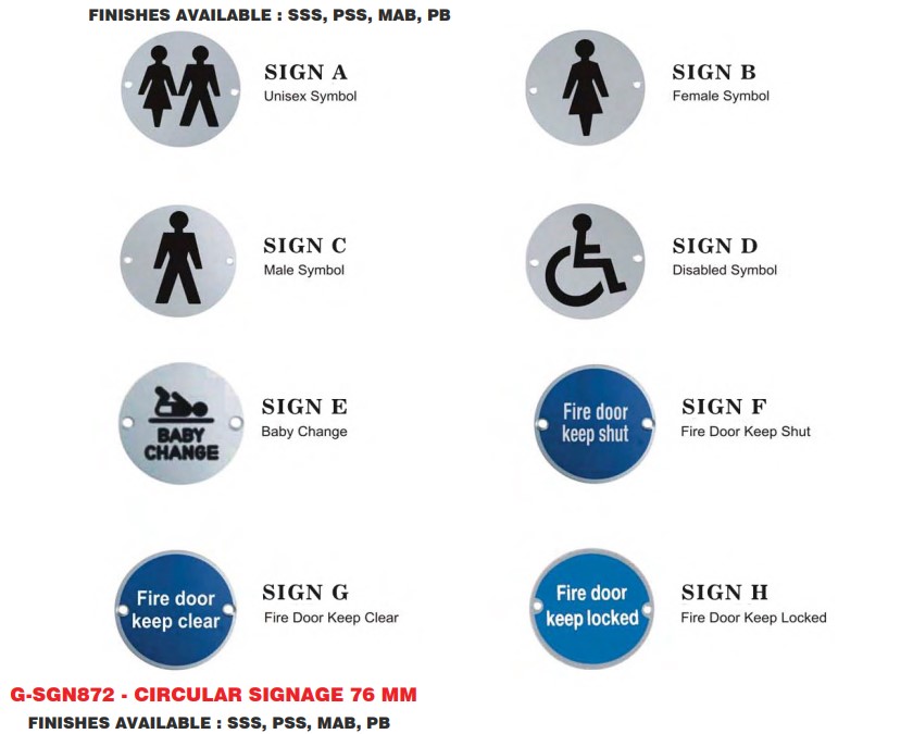 The G-SGN872 Circular Signage (76 mm) is designed for clear labeling and visual guidance in both residential and commercial environments. Crafted from high-quality, corrosion-resistant material, it ensures long-lasting performance with minimal maintenance. Its circular form adds a modern touch, making it perfect for restrooms, meeting rooms, or directional signage. The clean design allows for laser-etched or printed messages, icons, or symbols for improved readability. Easy to mount on doors or walls, the G-SGN872 delivers reliable function with a sleek, contemporary look.