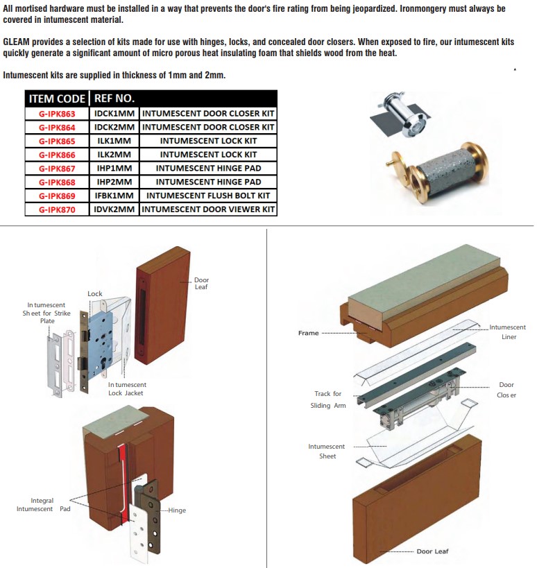 Gleam Intumescent Protection Kits are critical components for fire-rated door assemblies, designed to expand under high temperatures and seal gaps around hardware to prevent the spread of fire and smoke. These kits are typically installed beneath hinges, locks, latches, closers, and other ironmongery, ensuring that fire doors maintain their protective function during a fire emergency. Manufactured using high-performance, intumescent materials, they comply with fire safety standards and are easy to fit with minimal tools. Ideal for commercial buildings, residential complexes, and public institutions, Gleam’s Intumescent Kits are a must-have for enhancing life safety and regulatory compliance.
