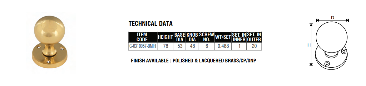 The G‑6310057‑BMIH knob set features a large 78 mm diameter knob and 53 mm base, projecting a refined look and comfortable grip. Its sturdy construction comes with a matching screw set for secure installation. Available in polished & lacquered brass, chrome plated, or satin nickel finishes, it adds both visual appeal and durability. With a projection of 48 mm and a sleek 6 mm backplate thickness, this knob set seamlessly enhances doors in upscale homes and offices.